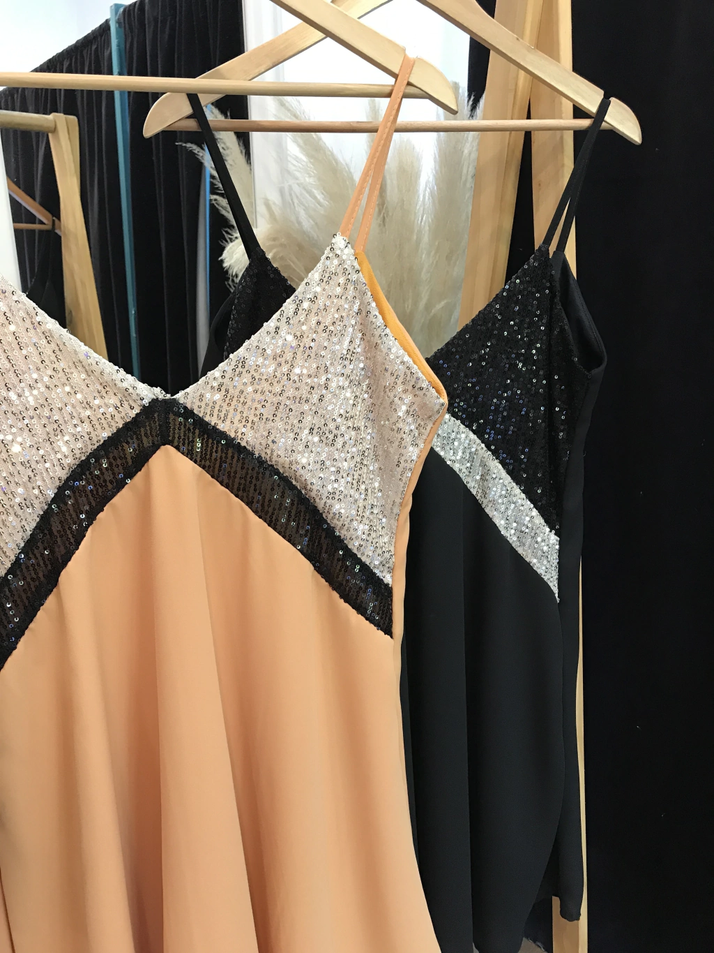 Vestido de crep forrado con detalles de lentejuelas en busto